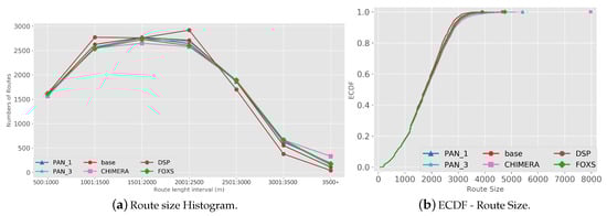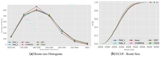 - Route size Histogram: the histogram of the number of routes by its size grouped into intervals of 500 m.