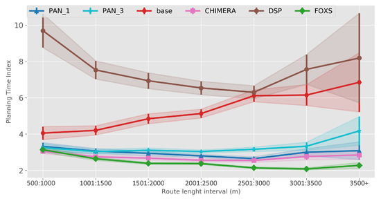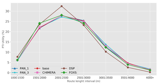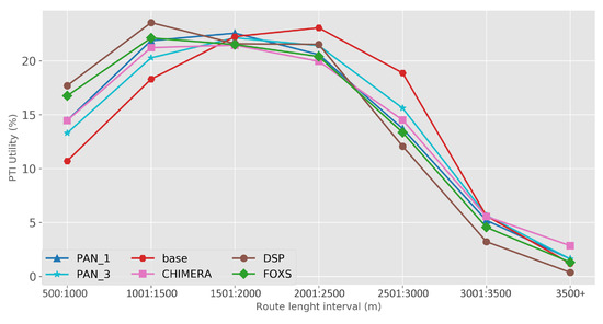 The metric PTI was reduced in 49% by FOXS, in 44% by CHIMERA and in 39% by PAN1 compared to BASE (Figure 18) showing the efficiency of these solutions. These results show that FOXS is able to better handle the city traffic, corroborating with the results obtained in Figure 17. As we can see in Figure 19, Cologne scenario has short routes where 80% of routes are shorten than 2.500 m (see Figure 19b) and approximately 60% of the routes its between 1.500 m and 2.500 m (see Figure 19a). Short routes hamper a good response of routing solutions since the set of alternative routes will be smaller. Introducing the PTI for each size range of routes showed in Figure 20, the FOXS had decreases the PTI when the route increases. These two graphs show that FOXS is better on larger routes in this specific scenario. The analyzes of the PTI Utility metric (see Figure 21) presents that 75% of more congested routes has a size between 1.000 m and 2.500 m.