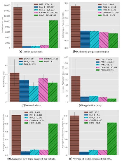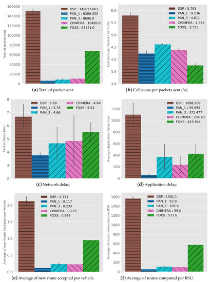Analyzing the network metrics, in Figure 14 we can see the results to the defined metrics. As seen in the traffics results, FOXS obtained better performance in traffic management. However, FOXS generates a higher amount of network messages (10384) compared to the CHIMERA, PAN1 and PAN3 (Figure 14a). This happens due to the FOXS congestion detection mechanism be more effective. Consequently, increasing the average routing performed by the vehicles in the system (routes received and altered by the vehicles) thus improving urban traffic. Figure 14e shows that the FOXS obtained an average of routing per vehicle compared to in CHIMERA thus, exchanger fewer control messages with the RSU. Note that a high number of routing performed by vehicles (e.g., DSP with ) does not imply in a better result in the traffic (see Figure 9). Figure 14f presents the average of routes computed per RSU in the scenario during the simulation. These values are directly related to the average of new route accepted per vehicle.