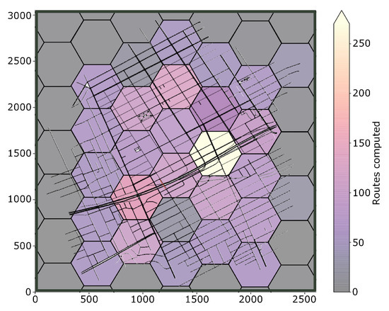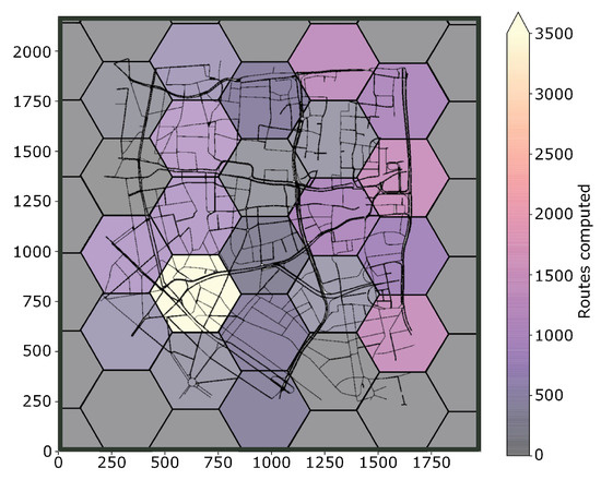 Figure 22a shows the total number of messages during the simulation. Note that FOXS sends more messages comparing to the CHIMERA, PAN1 and PAN3. However, FOXS has better average of the routes attributed to vehicles (see Figure 22e) compared to PAN1 (0.117 reroute per vehicle), PAN3 (0.233 reroute per vehicle) and CHIMERA (0.225 reroute per vehicle) (Figure 22e). Thus, the greater number of routed vehicles in the right way to increase to the quality of the city’s traffic. Note that the high number of routes accepted does not always produce a good result as seen in DSP (2.121 reroute per vehicle). The average of routes computed by each RSU-Cloudlet is presented in Figure 22f. FOXS had the average of 573.6 routes computed and PAN1, PAN3 and CHIMERA had the average of 52, 105.6 and 99 routes computed respectively. The high number of routes computed by FOXS not becomes a problem because of the use of the Fog paradigm, which distributes the calculation of the routes by regions in several Cloudlets. Figure 23 geographically shows these route calculation distribution of FOXS on the map exposing the areas with the most demand for Cloudlets.