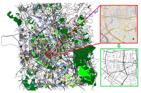 Cologne scenario is a sub-part of a TAPAS Cologne scenario [49] (presented in Figure 16) that includes the 24 h of the mobility trace of the vehicles, obtained through real monitoring of the city traffic. Due to the large scale of the TAPAS scenario, we used a more critical traffic time (7 am to 8 am) and a sub-area of 4.5 km of the Cologne downtown. This area possesses the greatest density and flow of vehicles, thus maintaining the representation of the scenario for our analysis. This scenario has approximately 14.000 vehicles inserted during the simulation and roads with 243 km of total length.