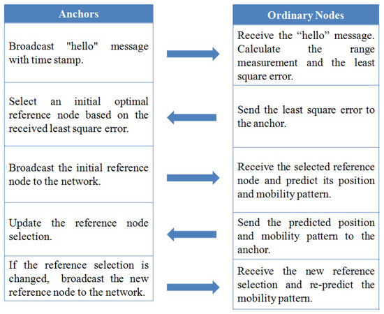 - Each unknown ordinary node predicts its own mobility pattern and position according to the range measurements as in Equation (9) and sends them to the anchors;