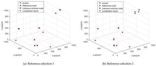 In Figure 7a,b have the same network structure; however, Figure 7a has a higher localization accuracy than that of Figure 7b. The only reason that causes the difference in localization accuracy is the different reference selection scheme.