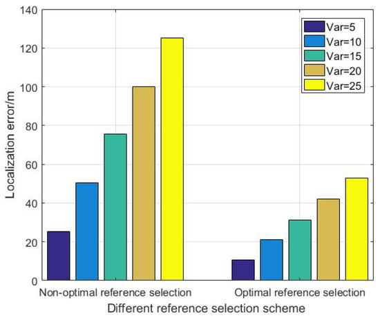 Figure 8 shows the comparison of localization error at the initial time between non-optimal reference selection scheme and the proposed optimal reference selection scheme. is the variance of the observation error.