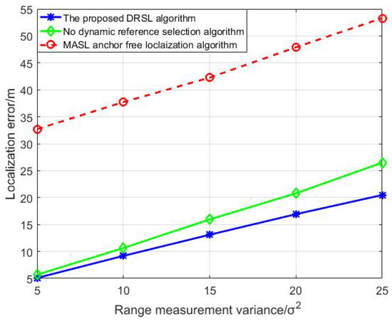As can be seen in Figure 12, With different range measurement variance, the localization error of the dynamic reference selection scheme is less than that of the scheme without dynamic reference selection. Figure 12 demonstrates that the dynamic reference selection scheme can greatly improve the localization performance for DUANs with network topology changing problem.