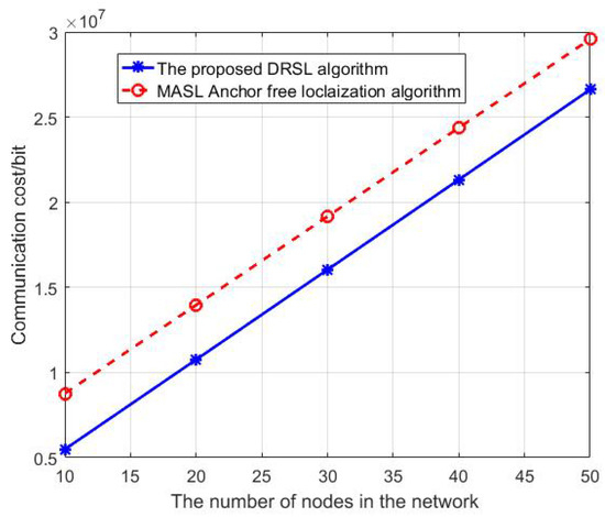 Increase the number of nodes in the network from 10 to 50. The time duration of localization T is set to be and the estimation period is set to be and the test period is set to be . The comparison between the DRSL algorithm and the MASL anchor-free approach on communication cost is shown in Figure 15.