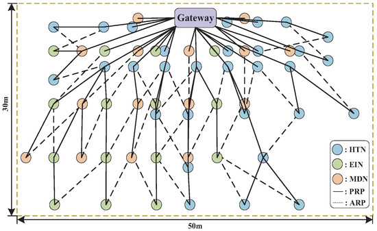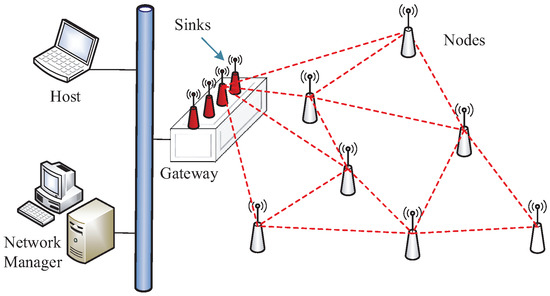 Deterministic communication heavily relies on resource scheduling management. Accordingly, network management techniques adapted for industrial wireless mesh are critical. This paper adopts centralized management to form a deterministic WSAN, the structure of which is shown in Figure 1. A network mainly consists of field nodes, multiple sinks, a gateway, and a centralized network manager. All field nodes operate over low-power radios compliant with the IEEE 802.15.4-2006 standard, which supports 16 channels in the 2.4 GHz ISM band. The TSCH MAC protocol is implemented in this paper to guarantee deterministic communication. One time slot is 10 ms long and allows for channel switching and the transmission of a single packet together with data-link acknowledgement (DL-ACK). Time slots can be either dedicated or shared, where the shared time slot is amended to CCA-Embedded Slot (CES) as proposed in Reference [34]. In a dedicated time slot (DTS), only a single transmitter–receiver pair can communicate on any given channel, thereby not allowing channel reuse. CES, in which multiple nodes are scheduled on the same channel, is mainly used for decreasing the use of slots for path crossing.
