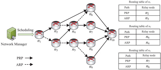 To guarantee the reliability of the flow transmission, we adopt the graph routing retransmission approach advised in the WirelessHART standard. As shown in Figure 2, packets can be sent by a device which has two direct neighbors at least in a graph. One is the primary routing path (PRP), and another is the alternative routing path (ARP). Each type of path has a receiving node for relaying packets. A node should preferentially send packets along the PRP. If the transmission is failed in PRP, the node will change to using ARP. In this paper, we assume that the multipath graph is already generated by the network manager. Therefore, all the possible transmissions should be involved in a slot and channel scheduling. The scheduling of slot and channel for all packet flows also has some considerations and limitations in the following based on WirelessHART.