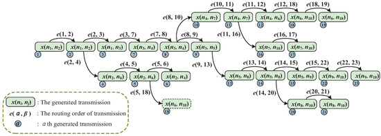 To illustrate the function of , we consider the topology shown in Figure 2 as an example. The flow is generated by node and transmitted to node . As shown in Figure 3, the generated transmissions in X are in released sequence after executing Algorithm 1. For example, the first released transmission is , and the fourth is . The transmissions in X also need sequence collection E to further explain their routing order, where represents that the 4th transmission must occur after the second transmission . The transmissions without orders can occur simultaneously, which means they can be allocated for the same slot with different channels. We can see that the two adjacent transmissions may not be in continuous order, such as the 6th transmission and 7th transmission . We also notice that E has two orders, and , where the transmission should go after the 5th and 12th transmissions. Actually, we only need to comply with the latter order, , which should be considered in slot and channel allocation.