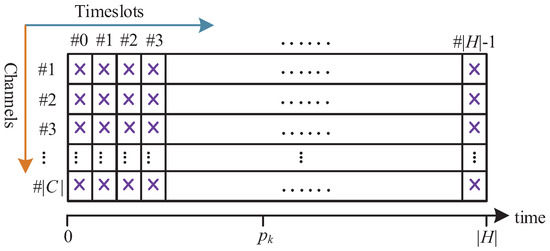 We use to denote which transmission is allocated on time slot t and channel c. The number of slots in a hyperframe is denoted by . As an example, if the first transmission of flow is allocated for slot 0 and channel offset 0, it can be expressed as , otherwise, it is if there is no transmission allocated to . We assume that the deadline of a flow transmission is equal to its period in this paper. Thus, all the transmissions in a flow should be scheduled within the period, where the constraint can be expressed by Equation (7).