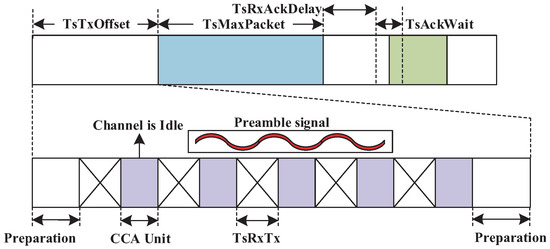 At a CES, the timing structure of the transmitting node is shown in Figure 5 and the destination node still accords with the standard. The main adaptation is to add CCA units (128 μs) in the TsTxOffset, which is the 2120 ± 100 μs duration between the beginning of the slot and the start of the data frame transmission. We respectively reserve 200 μs and 340 μs at the beginning and end of TsTxOffset for some preparation of the slot and data frame. In CCA units, we adopt CCA mode 2 in IEEE 802.15.4 standard, where CCA shall report a busy medium upon the detection of a signal with the modulation and spreading characteristics of an IEEE 802.15.4 compliant signal. The maximum number of CCA units is 5 in this paper. Multiple source nodes will contend this slot by randomly selecting a CCA unit to detect the state of a channel. Once a source node detects that the channel is free, it sends a preamble signal to occupy the current slot during the remaining time TsTxOffset. Another source node will detect the preamble; then, it stops to perform CCA and to give up using the current slot. The radio chip may switch the state and channel in TsRxTx, which is less than 192 μs. We assume that there are K transmissions with different source nodes and the same destination node. The probability of successful contention is and enough to guarantee the reliability of the flow transmission, since the contention at CES occurs only when the DL-ACK is lost on the previous link. The use of CES is to decrease abundant slot allocation and to increase slot use, which also results in the increase of schedulable ratios.