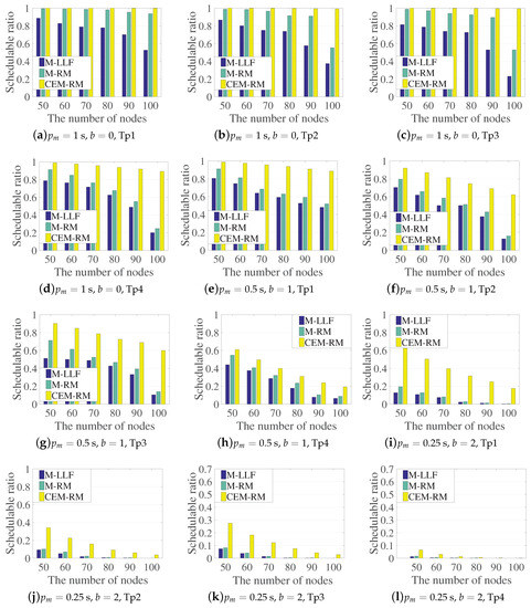 Figure 6 shows the schedulable ratio of the three scheduling policies with different parameter configurations. The number of nodes ranges from 50 to 100. We randomly generate 8000 cases for each node quantity and use the three algorithms to schedule the generated topologies separately. The number of available channels is set to be the maximum, 16, for a better comparison, since several cases using less channels are hardly scheduled with the existence of diverse periods. In Figure 6a–d, the three algorithms, which execute on each type of topology with s and , can successfully schedule the majority of graphs. Obviously, the schedulable ratio drops in pace with the increase of nodes; however, we can see that our proposed scheduling is almost unaffected with these configurations. With the period shortened and diversified, the number of schedulable graphs decreases dramatically. Figure 6e–h and Figure 6i–l show the results under the period configurations of s, and s, , respectively. They clearly indicate that the schedulable ratio of CEM-RM is higher than that of M-LLF and M-RM. Especially, increasing the number of nodes makes the gaps between CEM-RM and the others even bigger.