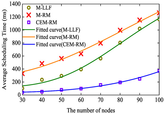 The execution time of a scheduling can affect the performance of network formation and rescheduling; thus, we have measured the average run time of the three algorithms. Each test with a different number of nodes and algorithms includes 100 successfully scheduled graphs. To guarantee that the tested graphs are more schedulable, we set s and in all tests. As displayed in Figure 7, the markers represent the average time of different algorithms with different numbers of nodes and the lines show the trend of scheduling time as the number of nodes is increased. We can obtain that the average execution times of M-LLF and M-RM are lower than 1264 ms, while the time of our proposed scheduling is lower than 371 ms. The results indicate that CEM-RM is better for the performance improvement of network formation or rescheduling.