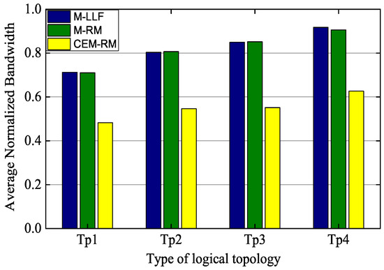 Moreover, Figure 8 shows the average requirement of the wireless bandwidth for our scheduling and for the others. The normalized bandwidth is calculated by the ratio between the number of allocated resources and total resources in a hyperframe. We also select the successfully scheduled hyperframe with 100 nodes and the configuration of s, . As can be seen, the average normalized bandwidths of Tp4 of M-LLF and M-RM are 0.918 and 0.906, respectively, which are similar to each other, while CEM-RM only requires 0.627. The same conclusion also applies to other types of topologies. This is because the number of transmissions is determined by a graph in M-LLR and M-RM. However, CEM-RM adopts CES to solve the problem of overlapping paths and to reduce the phenomenon of DL-ACK loss, which can decrease the number of dedicated slots additionally. The remaining unscheduled resources can be allocated for network management to improve network stability.