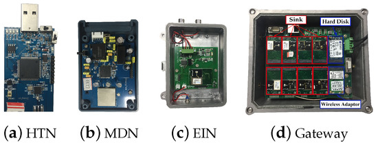 Our wireless nodes used to collect corresponding information are implemented on a LPC1769 mote with an AT86rf231 radio transceiver. In reality, we have three kinds of information to be collected, which are temperature and humidity (HT) with a 1-s period, electrical information (EI) with a 0.5-s period, and machine data (MD) with a 0.25-s period. Each kind of information is collected by different versions of wireless node, respectively shown in Figure 10a–c. A total of 60 nodes consist of 30 HT nodes (HTN), 15 EI nodes (EIN), and 15 MD nodes (MDN). The information of MD is collected through a CAN (Controller Area Network) bus, and the EI is transmitted by RS485. The radio transmission power is 3 dBm, and we use 10 of the available channels with lower packet error rates. The multi-sink-based gateway with 8 sinks, a hard disk, and a wireless adaptor is shown in Figure 10d. The communication between multiple sinks and the gateway is constructed by USB port. The metal case is used to avoid dust and water to increase the lifetime. The generated topology is shown in Figure 11, and the remaining experimental parameters are listed in Table 3.