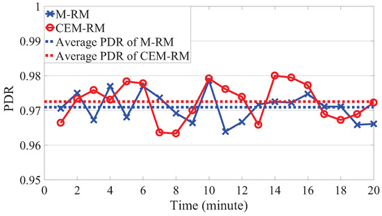 On the one hand, we first measure the packet delivery ratio (PDR) of M-RM and CEM-RM, as shown in Figure 12. The PDR represents the ratio between the number of packets that succeed in arriving to the gateway on time and the total number of generated packets. Since the period of packet generation is known previously, we can get the total number of packets of each node. Then, we gather the statistic of the number of packets that successfully reach the gateway within their own deadline. An experiment remains 20 min, and we assess the PDR every minute. The average PDRs of M-RM and CEM-RM for 20 min are 0.971 and 0.973, respectively. We can observe that their PDR for every minute vibrates over their average values because the condition of channels may change with time. The jitter of our CEM-RM is a little higher than that of M-RM, where the minute-PDR standard variations of M-RM and CEM-RM are 0.0042 and 0.0055, respectively. The time-varying channel has an effect on the adopted CES to a certain extent. However, the average PDR is mainly the same, which means that the schedulability of our proposed scheduling is improved but does not sacrifice reliability.