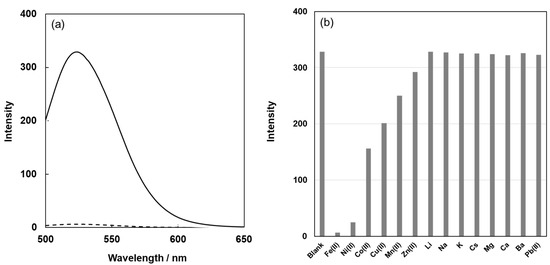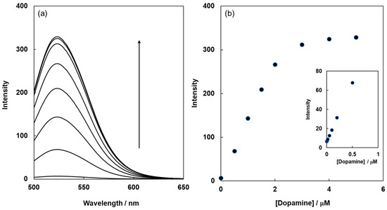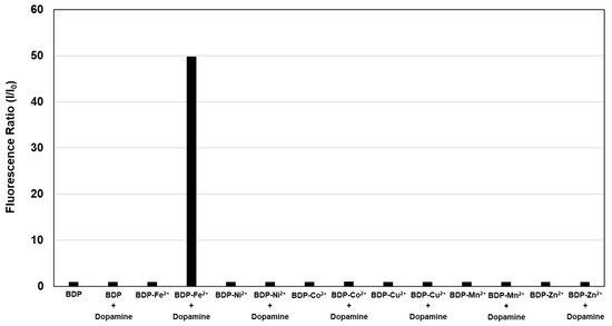 To study the reaction of Fe2+ with BDP, fluorescence spectra were investigated, and the signal was monitored by mixing BDP (1.0 µM) with Fe2+ (5.0 µM) in HEPES (20.0 mM; pH 7.2) to form BDP-Fe2+. The fluorescence intensities of BDP decreased following the addition of Fe2+ due to the considerable quenching effect, as shown in Figure 3. Other metal cations (Ni2+, Co2+, Cu2+, Mn2+, Zn2+, Li+, Na+, K+, Cs+, Mg2+, Ca2+, Ba2+, and Pb2+) were added to the solution of BDP, and the fluorescence intensities were monitored. The observed order of the fluorescence intensity was as follows: Fe2+ (6.5) > Ni2+ (25.0) > Co2+ (156.0) > Cu2+(201.5) > Mn2+ (250.2) > Zn2+ (292.3). Fluorescence quenching did not take place for alkali metal ions, alkaline earth metal ions, and Pb2+, as shown in Figure 3b. Thus, Fe2+ was a particularly strong quencher of BDP fluorescence. To take advantage of this phenomena, the BDP-Fe2+ complex was used in this study, because we used the ligand exchange mechanism, and a large fluorescence enhancement from quenching state was requested, enabling the highly sensitive detection of dopamine by the dissociation of Fe2+ from BDP-Fe2+.