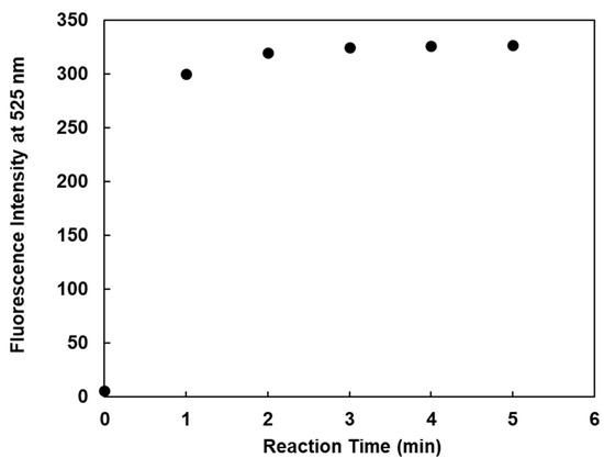 Figure 5 shows the reaction time dependence of the fluorescence intensity at 525 nm of BDP-Fe2+ with dopamine. The fluorescence intensity saturated after 3.0~5.0 min, and 5.0 min was considered optimal for the reaction between BDP-Fe2+ and dopamine.