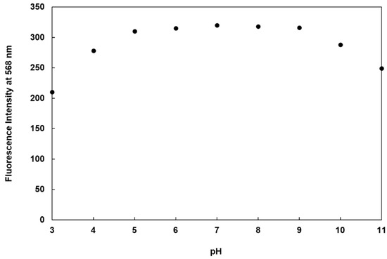 In order to understand how pH affects the reaction between BDP-Fe2+ and dopamine, fluorescence signals were monitored at different pH values. Figure 6 shows the fluorescence intensity at 525 nm of BDP-Fe2+ with 5.0 µM of dopamine. At high pH values (10 to 11) and low pH (3 to 4), the reaction of BDP-Fe2+ with dopamine was inhibited by the solution pH, whereas the fluorescence intensity was nearly unchanged when the pH was in the range 5–9. As a result, the reaction of BDP-Fe2+ with dopamine was neither inhibited nor masked at a physiological level of pH values, and this assay should be appropriate to monitor the quantitative analysis of dopamine under such conditions.