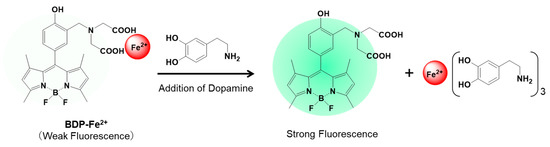 In this study, a new fluorescent molecular probe has been developed with the boron–dipyrromethenyl (BDP) group as the fluorescent emitter [22,23] and an imino-di-acetic acid-Fe2+ complex both as a fluorescent quencher and a ligand exchange moiety for the detection of dopamine. The BDP group has interesting spectral properties such as high quantum yields, large extinction coefficients, and high photostability—characteristics that satisfy the above concept of molecular design [24,25]. The chemical structures of the fluorescent reagents (BDP and its Fe2+ complex, BDP-Fe2+) are shown in Figure 1. The interactions of these molecules with dopamine were investigated, along with their selectivity, sensitivity, photostability, and detection in human serum samples. The results clearly indicated that BDP-Fe2+ acts as a reliable fluorescent probe, and it is useful for the high-throughput analysis of dopamine.