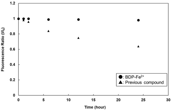 Fluorescence ratios of BDP-Fe2+ and previously reported compounds, following the irradiation of excitation light for 24 h; [BDP-Fe2+] = [previous compound] = 1.0 µM; excitation wavelength: 490 nm for BDP-Fe2+, and 455 nm for previous compound.