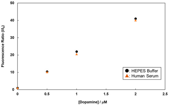 Fluorescence ratio of BDP-Fe2+ at 525 nm following the addition of dopamine at different concentrations; [BDP-Fe2+] = 1.0 µM; solvent = HEPES buffer solution (pH 7.0) or human serum; excitation wavelength = 490 nm. Y axis, I: fluorescence intensity of BDP-Fe2+ at 525 nm before and after addition of various amino compounds, and I0: fluorescence intensity of BDP-Fe2+ at 525 nm.