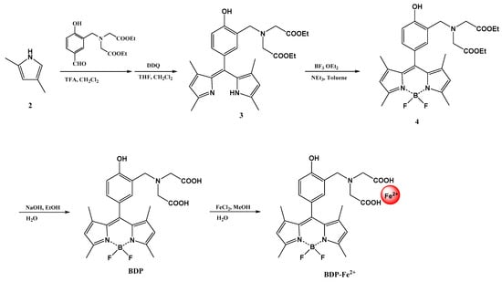 2.3.4. 2,2’-((5-(5,5-Difluoro-1,3,7,9-tetramethyl-5H-4λ4,5λ4-dipyrrolo[1,2-c:2’,1’-f][1,3,2]diazaborinin-10-yl)-2-hydroxybenzyl)azanediyl)diacetic acid Fe(II) complex (BDP-Fe2+)