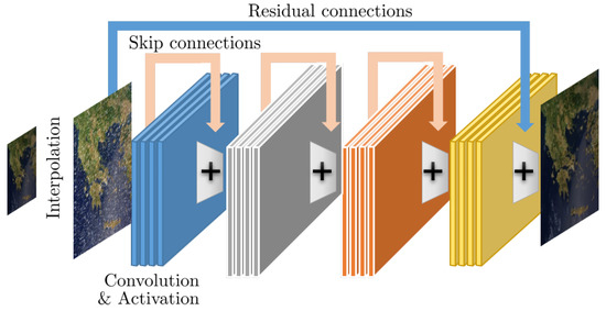A typical CNN architecture targeting the enhancement of remote sensing images is shown in Figure 1. In addition to the typical convolutional layers, start-of-the-art design also include architectural components like residual layers and inception modules which have been shown to significantly increase performance.