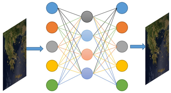 A classical autoencoder (AE) is a deterministic DNN comprised of an input and an output layer of the same size with a hidden layer in between, which is trained with back propagation in a fully unsupervised manner, aiming to learn a faithful approximation of the input [36]. Specifically, the formulation considers both as an input and as the output examples , and encodes the information through a nonlinear function , such that each input vector is mapped to a new feature space via M hidden units. An illustration of a single layer AE is shown in Figure 3