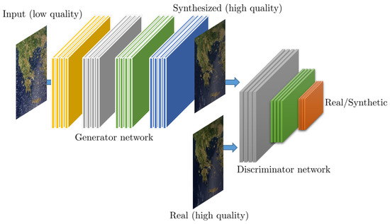 In the original formulation of the GAN framework [43], the generator is seeded with randomized noise input which leads to different output realizations, depending on its statistical characteristics. For image enhancement problems, a variant of GANs, called conditional GANs (cGANs), is more appropriate since the input to the generator is the image itself, although it could be very different from the output, such as an edge map [45]. A typical cGAN architecture is shown in Figure 4