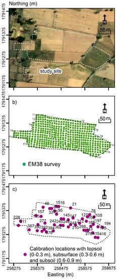 (a) Air-photo of study site; (b) EM38 survey transects (i.e., 17) and, (c) calibration locations (46) where topsoil (0–0.3 m), subsurface (0.3–0.6 m) and subsoil (0.6–0.9 m) samples.