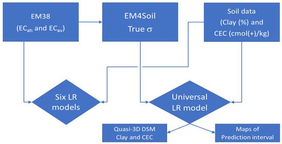 Figure 2 shows the flow chart of the two different approaches we undertook. First, we looked to see if six independent MLR models that can be developed between the ECa (i.e., ECah and ECav) data and clay and CEC in either the topsoil (0–0.3 m), subsurface (0.3–0.6 m) and subsoil (0.6–0.9 m). Secondly, we look to see if a satisfactory LR model can be developed between true electrical conductivity (σ—mS/m) as inverted from EM38 ECah and ECav, and clay (%) and CEC (cmol(+)/kg) at all depths using a universal LR, which is applicable at any depth.