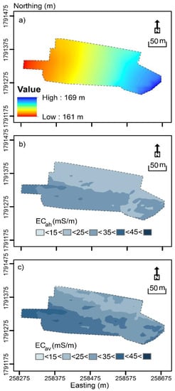 Figure 3c shows the contour plot of measured ECav. Again, the study field was characterized by intermediate-small ECav in the northern half which started from the east through the north west corner and intermediate-large ECav (35–45 mS/m) in the west. From Figure 3b,c and Table 3, we surmise that the subsurface and subsoil were likely to be more conductive than the topsoil.