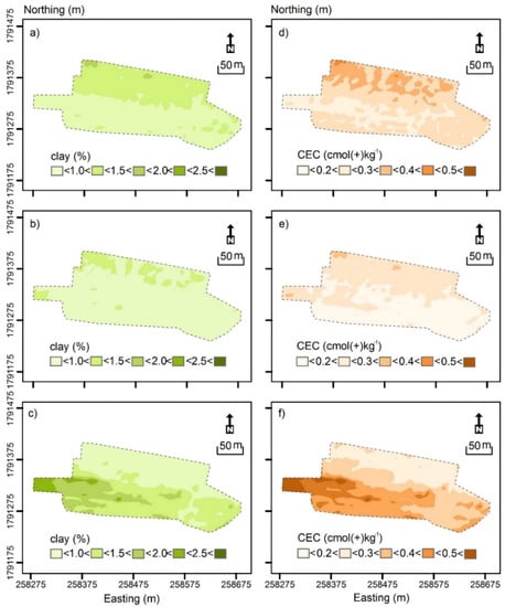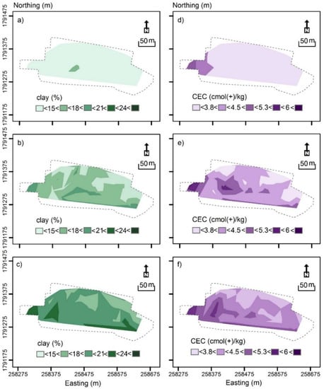 Figure 8 shows the Digital Soil Mapping (DSM) of predicted clay and CEC at the three sampled depths generated from the LR developed between σ (mS/m) and clay and or CEC. Figure 8a shows predicted topsoil (0–0.3 m) clay. The DSM was like the contour plot generated from the 46 sampling points (Figure 4a) alone. Figure 8b shows the DSM for the subsurface (0.3–0.6 m). The northern half was characterised by small (<15%) clay, while the southern half by intermediate-small (15–18%) clay. These predictions appear less consistent with measured subsurface clay (Figure 4b). Figure 8c shows predicted clay for the subsoil (0.6–0.9 m).