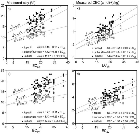 Plots of linear regression (LR) between apparent electrical conductivity (ECa—mS/m) measured in (a) horizontal (ECah; 0–0.75 m) and (b) vertical (ECav; 0–1.5 m) modes of EM38 and measured clay (%) in the topsoil (0–0.3 m), subsurface (0.3–0.6 m) and subsoil (0.6–0.9) and plots of LR between (c) ECah and (d) ECav and measured cation exchange capacity (CEC—cmol(+)/kg) in the topsoil, subsurface and subsoil.