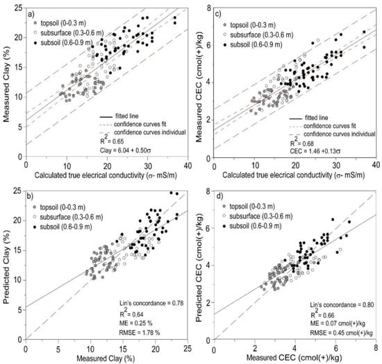 Plots of measured (a) clay (%) and (c) cation exchange capacity (CEC—cmol(+)/kg) versus true conductivity (σ—mS/m) using λ of 0.07 and 0.9 and S1 inversion algorithm with full solution, respectively; and, plots of measured versus predicted (b) clay and (d) CEC using leave-one-out cross-validation, for topsoil (0–0.3 m), subsurface (0.3–0.6 m) and subsoil (0.6–0.9 m).