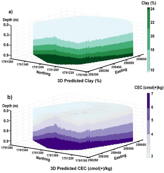 However, the conventional ways of measuring these soil properties are costly and time-consuming owing to the soil sampling and laboratory analysis. Nevertheless, much research has shown that if many soil samples can be collected, clay and CEC can be mapped using classical geostatistical methods [,]. Among the first to map topsoil (0–0.3m) clay and CEC in this way where [], who used punctual kriging of soil sample locations at the field scale. More recently, [] predicted topsoil (0–0.15 m) and subsurface (0.3–0.5 m) CEC using various types of kriging (i.e., ordinary) across a large area of North Dakota, USA. Similarly, [] used additive and modified log-ratio transformation of soil particle size fraction (psf) using ordinary kriging. They then compared this to the untransformed psf data using various kriging techniques (i.e., compositional ordinary- and ordinary-kriging) to predict the topsoil (0–0.1 m) clay, across a very large area in south-eastern Australia. However, a major disadvantage of such geostatistical approaches is that many samples (>100) are required, which need to be spatially correlated and variable [,] to yield good results.