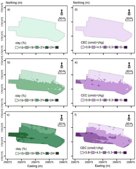 Spatial distribution of predicted clay (%) at depths of (a) topsoil (0–0.3 m), (b) subsurface (0.3–0.6 m) and (c) subsoil (0.6–0.9 m) generated using linear regression (LR) model (Figure 5a), and cation exchange capacity (CEC—cmol(+)/kg) in (d) topsoil, (e) subsurface and (f) subsoil.