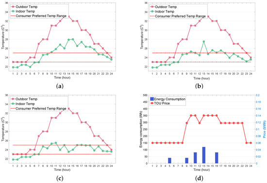 Figure 8a–c illustrate the effects of varying preferred operating time intervals of the WM on the WM energy consumption. The results from these figures correspond to three different operating time intervals, namely (6:00 a.m., 10:00 p.m.) (Figure 8a), (12:00 p.m., 10:00 p.m.) (Figure 8b), and (5:00 p.m., 10:00 p.m.) (Figure 8c), where the finishing time in each time interval was identically set to 10 p.m. with varying starting time ( = 6:00 a.m., 12:00 p.m., and 5:00 p.m.). It can be observed from Figure 8a–c that the optimal operating schedule of the WM was selected at the time periods with the lowest TOU price within the preferred operating time interval. This observation confirms that the WM agent could always determine the optimal policy to minimize the electricity bill successfully, provided that the consumer preferred operating time interval changed.