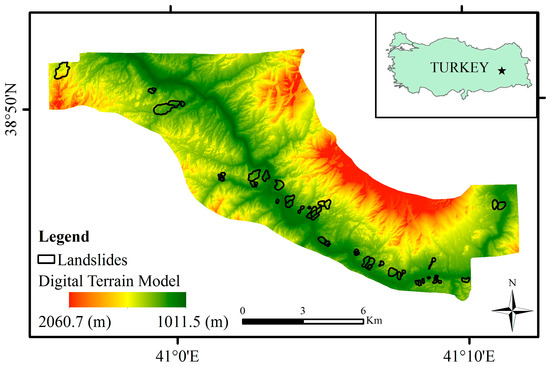 Figure 1 depicts location of the study area, the color-coded digital terrain model (DTM) of the year 2012 (before the dam construction), and the landslide inventory. The landslide inventory has been prepared manually using the orthophotos and the DTM of the year 2012. The area has been delineated according to a single lithology type to ensure that the whole area has the same lithological characteristics.