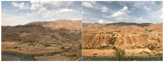 A total of 46 landslides occurring in the Solhan volcanic rocks were detected in the study area as shown in Figure 1. Although the landslide inventory of the study area was prepared from the DTM and the orthophotos, an extensive field study was also carried out in order to ground control of the landslide inventory (Figure 2). The landslides were classified as slide according to the classification system suggested by [32]. Additionally, according to [32], the activity states are mainly defined as dormant, the distribution of the activity is defined as retrogressing, and the main activity style is defined as successive. The minimum landslide area was calculated as 9725 m2, while the maximum landslide area was found to be 382,327 m2 (Table 1). To determine the landslide volumes, the empirical equation suggested by Larsen et al. [33] was implemented. Accordingly, the minimum and maximum landslide volumes were determined as 29,941 m3 and 802,017.7 m3, respectively. Considering the landslide dimensions defined by IAEG [34], the expected depths of failures were also determined. The minimum depth value was calculated as 19 m while that of maximum value was found to be 63 m. The mean depth value of all failures observed in the study area was calculated as 33 m. An additional landslide mapping was also carried out using the DTM produced from ortophotos taken in 2018. Both new occurrences of landslides and activities on the existing failures were determined in the data of 2018. The comparisons performed of which details are given in further sections of this paper, justify the landslide activity definitions given up to here.