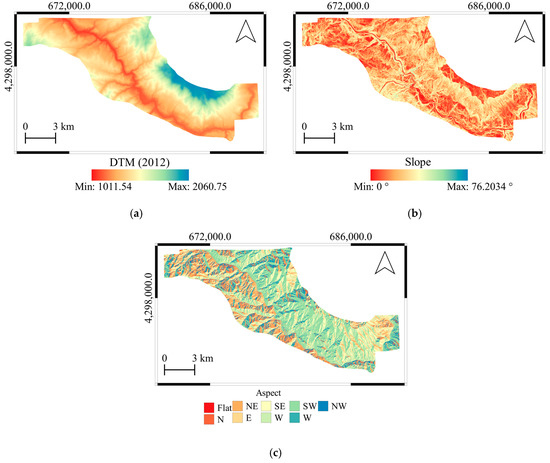 Spatial distribution of (a) altitude in meters, (b) slope in degrees, and (c) aspect as geographical directions. The parameters have been calculated from the DTM of year 2012.