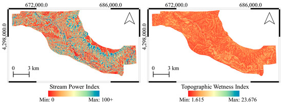 Topographic wetness index (TWI) defines the effect of topography on the location and size of saturated source areas of runoff generation [38]. The parameter TWI has been significantly investigated in landslide susceptibility mapping and constitutes one of the most common used conditioning factors [39]. Moore et al. [38] also suggested an equation for the calculation of TWI under assumed steady-state conditions and uniform soil properties (Equation (2)). Both the SPI and TWI maps of the study area provided in Figure 5.