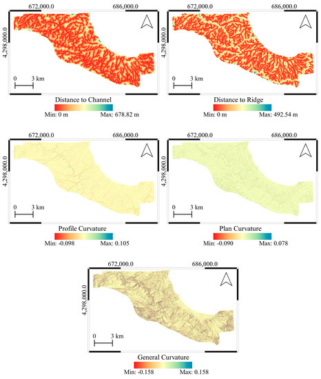 Distance maps to the channels and the ridges and the curvature (general, plan, and profile) parameters produced from 2012 DTM.