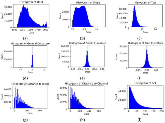 Slope curvatures are the second derivatives of DTMs. The curvature parameters define the rate of change of the first derivatives slope gradient and slope aspect in a certain direction [37]. In addition, the distances to the channels (drainage) and the ridges are also effective parameters on the landslide susceptibility and have been employed in previous studies [7]. The curvature maps (general, plan, and profile) and distance maps to the channels and the ridges produced from 2012 DTM are shown in Figure 6. The overall statistical values calculated from the topographic derivative parameters are given in Table 3. In addition, the histograms of all derivative calculations are shown in Figure 7.