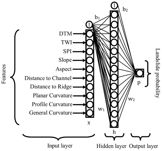 According to Figure 8, the input layer has totally 10 neurons. In other words, the parameters are optimally estimated in a 10 dimensional space. The network has one hidden layer with 20 neurons. The last layer has only one neuron, which shows the landslide occurrence probability. The mathematical relationship is denoted in Equation (5).