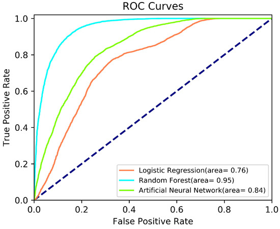 The ROC curves [52] and the AUCs for each model are demonstrated in Figure 9. This assessment method was used previously by several authors [53,54,55,56] to check the model performance. In the present study, the ROC curves were also used for same purpose. As shown in Figure 9, the RF method yields the best classification accuracy with an area value of 0.95, where ANN comes second in the performance with an area of 0.84. The LR algorithm leads to the least accurate results. Assessment of the ROC curve (Figure 9) shows that all ML approaches employed in the present study provide acceptable results.