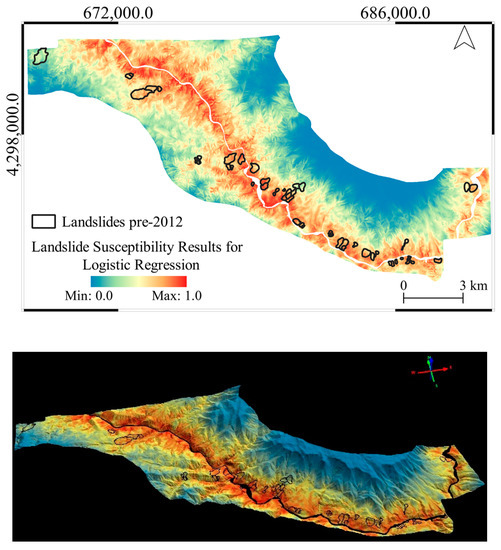 The general overviews of the produced landslide susceptibility maps are provided in Figure 10, Figure 11 and Figure 12 in both 2D and 3D. From the figures, it can be seen that LR produces a very similar output to the altitude classification map (DTM) from 2012, as shown previously in Figure 4.