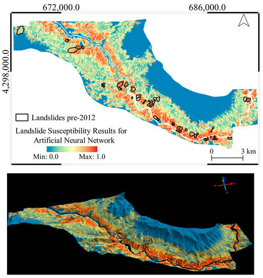The landslide susceptibility map produced with the ANN method in 2D (above) and 3D (below) visualization.