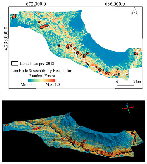 The landslide susceptibility map produced with the RF method in 2D (above) and 3D (below) visualization.